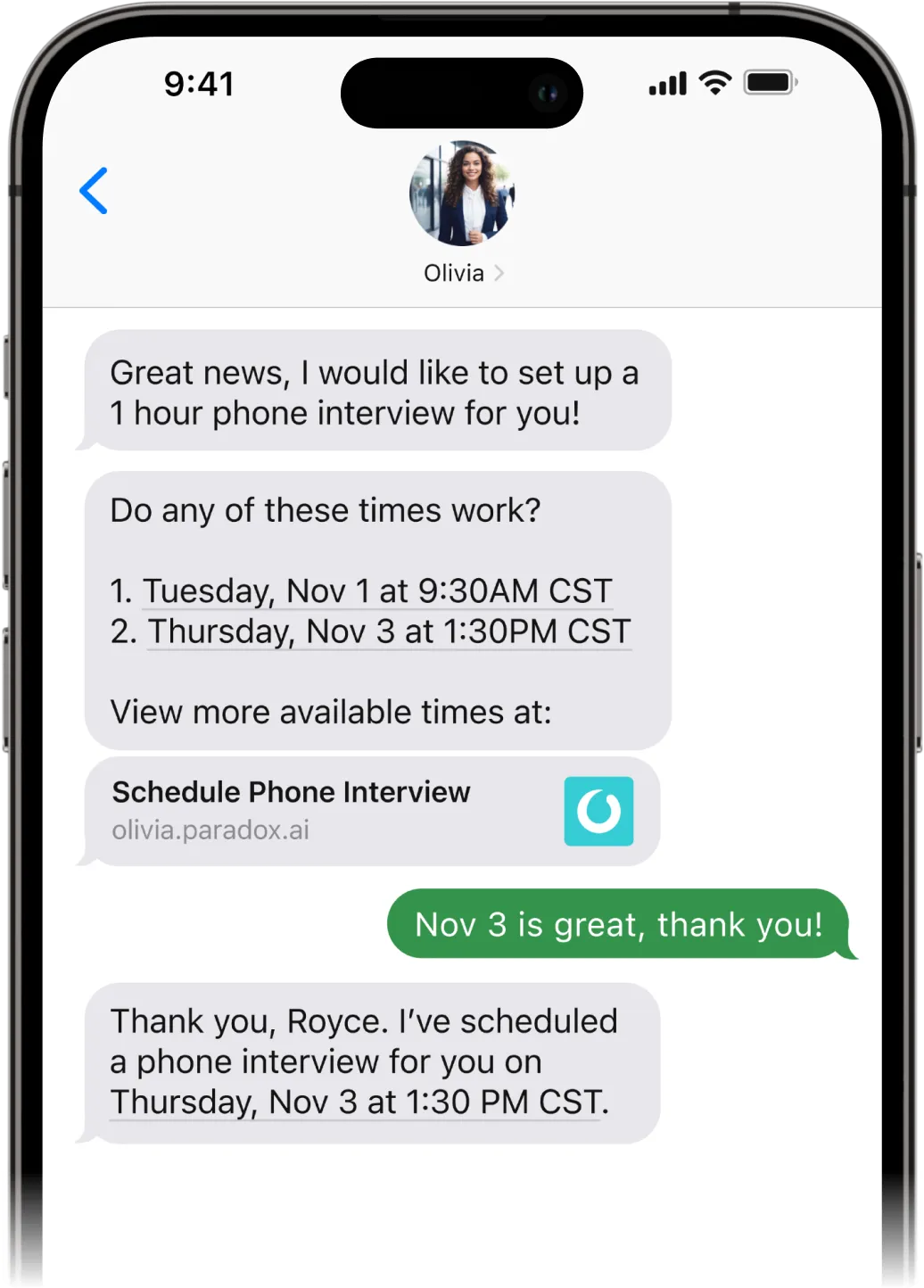 And functionally, Paradox creates a great candidate experience and a great hiring manager experience. I can't tell you how many times we’ve had a candidate that the recruiting team really liked and they wanted the hiring manager to talk to, but then the recruiter went out on vacation and something happened to the candidate on the day of their interview — something crazy, like their dog's car got a flat tire. So the candidate sends an email to the recruiter saying, “Hey, I'm not gonna be able to make this interview in two hours,” but the recruiter is on a beach somewhere. So the hiring manager is agitated because they feel like this otherwise great candidate stood them up. Now with Olivia, the candidate has the ability to say, “I'm not gonna be able to make it,” and they automatically get rescheduled. It just creates a much better experience for the hiring manager and it creates a better experience for the candidate. When you do those two things, you see success in hiring.